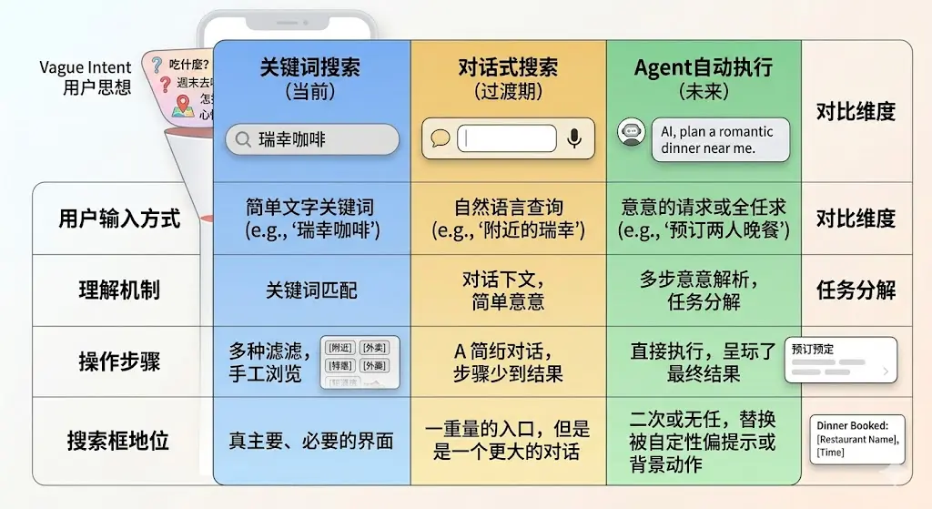 這不是遙遠的科幻,它是可以預期的近未來。搜索框不會因為某一天某個版本更新而消失,它會以用戶幾乎察覺不到的方式,被慢慢替代——就像人們不再“搜索天氣”,而是直接問語音助手一樣。
