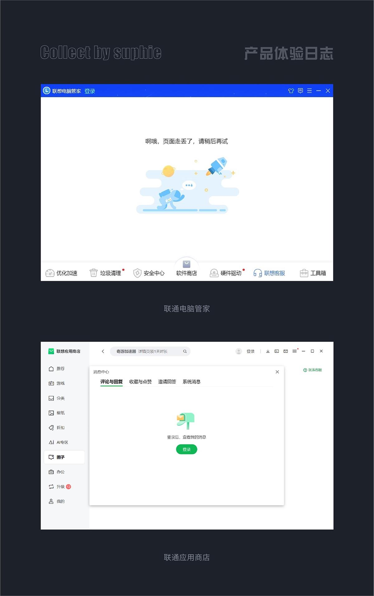 - 聯想電腦管家客服頁面異常時,給出清晰的文字提示 + 趣味插畫,既說明問題又安撫情緒。