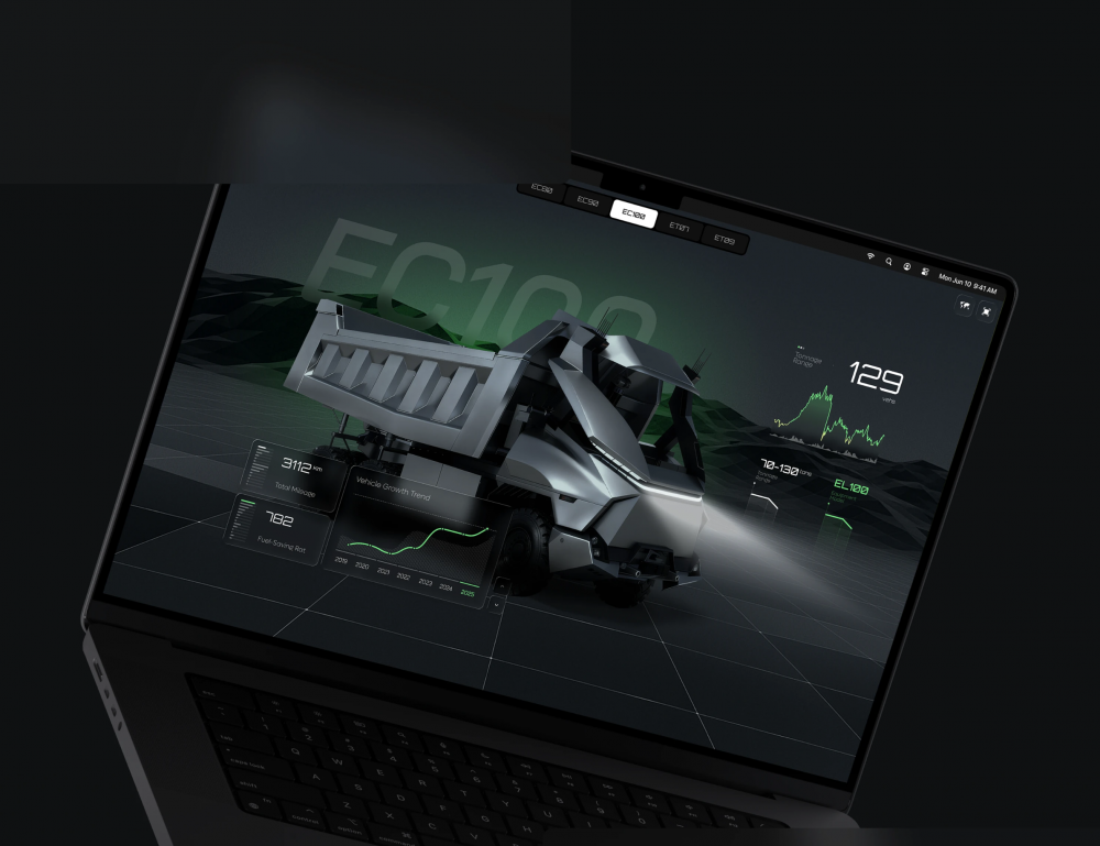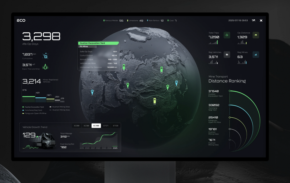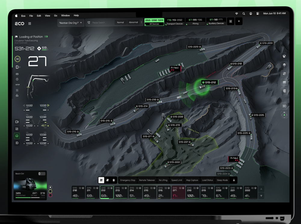 ECO 系統的視覺體系完全貼合礦山工業場景,以深邃的暗黑為基底,搭配高辨識度的科技綠作為主色調,既凸顯了工業系統的嚴謹性,又通過高對比度讓核心數據、車輛狀態、區域標識一目了然,完美適配礦山復雜的監控與操作需求。