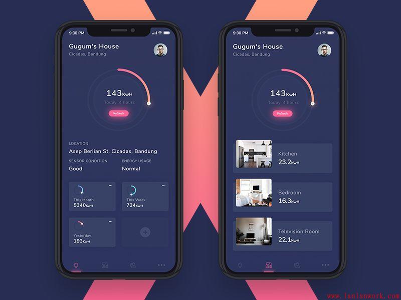 這款APP界面采用深灰色底色,沉穩大氣,有現代科技感,界面采用卡片式布局。配以粉紅和橘黃作為點綴,讓界面不因深色而顯得呆板。