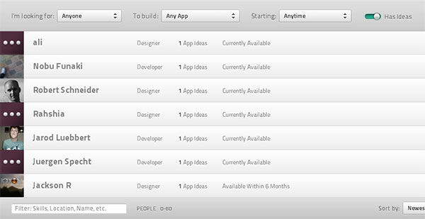 當(dāng)有大量數(shù)據(jù)要處理的時(shí)候過(guò)濾就很有用。使用下拉列表,單選按鈕或者復(fù)選框進(jìn)行過(guò)濾選擇。 在下面的例子里, builditwith.me使用下拉列表來(lái)對(duì)用戶的職業(yè)興趣和當(dāng)前狀態(tài)進(jìn)行過(guò)濾。