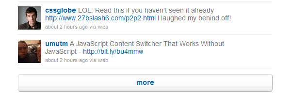 這種方式有一種變異版(或者說(shuō)另外一種方式)。與不間斷的滾動(dòng)顯示數(shù)據(jù)不同,在列表的最后,用戶可以選擇點(diǎn)擊更多按鈕瀏覽數(shù)據(jù)。Twitter就是這樣的一個(gè)好范例。