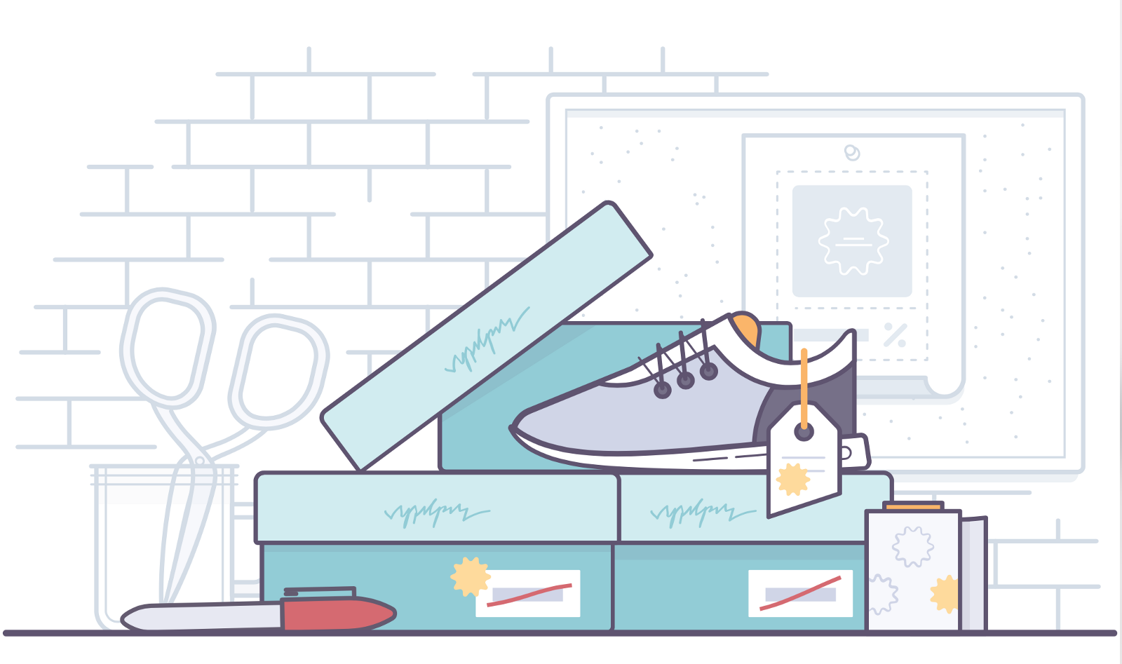 這個元素在線上和線下有相似之處。盡管我不認(rèn)為它是一類比喻,但在產(chǎn)品設(shè)計中我還是將它單獨拿出來說。比喻常用來展現(xiàn)觸動人心的部分,那是一件事情或者一個行動產(chǎn)生的積極感覺。不過,對于內(nèi)容傳遞給用戶的方式,團(tuán)隊更傾向于中立的寫實表達(dá)。不必告訴用戶我們的感受如何,只需簡潔傳達(dá)信息。用插畫的專業(yè)術(shù)語來表達(dá)則是:我們只愿意通過繪制寫實狀態(tài)下的物品,來幫助用戶理解線上的內(nèi)容。當(dāng)然,談到產(chǎn)品時,我們大多是在電腦上作畫,比如,你可以繪制20多個互相連接的空狀態(tài)頁面,來表達(dá)重復(fù)性。這也是我們在為用戶傳達(dá)內(nèi)容時增加的一種類比方式。比如下圖的例子,線上電子商務(wù)可以讓用戶通過優(yōu)惠碼輸入實現(xiàn)折扣,那么線下實體銷售折扣該如何表達(dá)呢?可能是一堆貼紙和帶著折扣價格的紅色標(biāo)記。我們能借助全新懷舊風(fēng)格的插畫為用戶帶來愉悅,同時還能保持中立,只是簡單清晰的表達(dá)信息。
