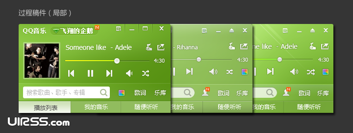 早在2011年7月,QQ音樂2011beta版的發布便確立了用品牌色–綠色,做為QQ音樂客戶端的默認顏色,綠色代表和平、希望、生長和環保,對QQ音樂的品牌形象有積極的正面意義,此外,縱觀競品,常見的客戶端配色多為黑和藍,用綠色也較利于提高產品的識別度。QQ音樂2012賀歲版的視覺,也是圍繞綠色和細節進行全面的體驗優化。項目從去年12月31號開始,進行了為期15天的設計和快速迭代。