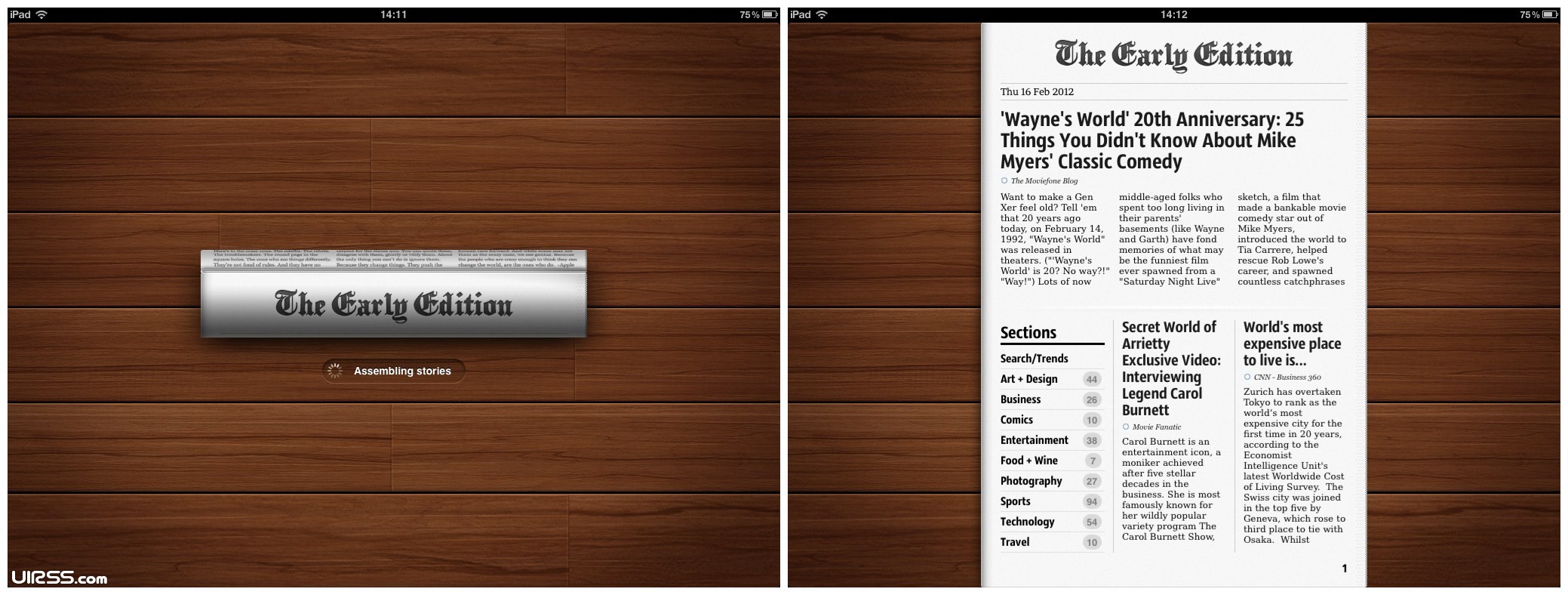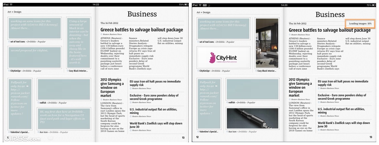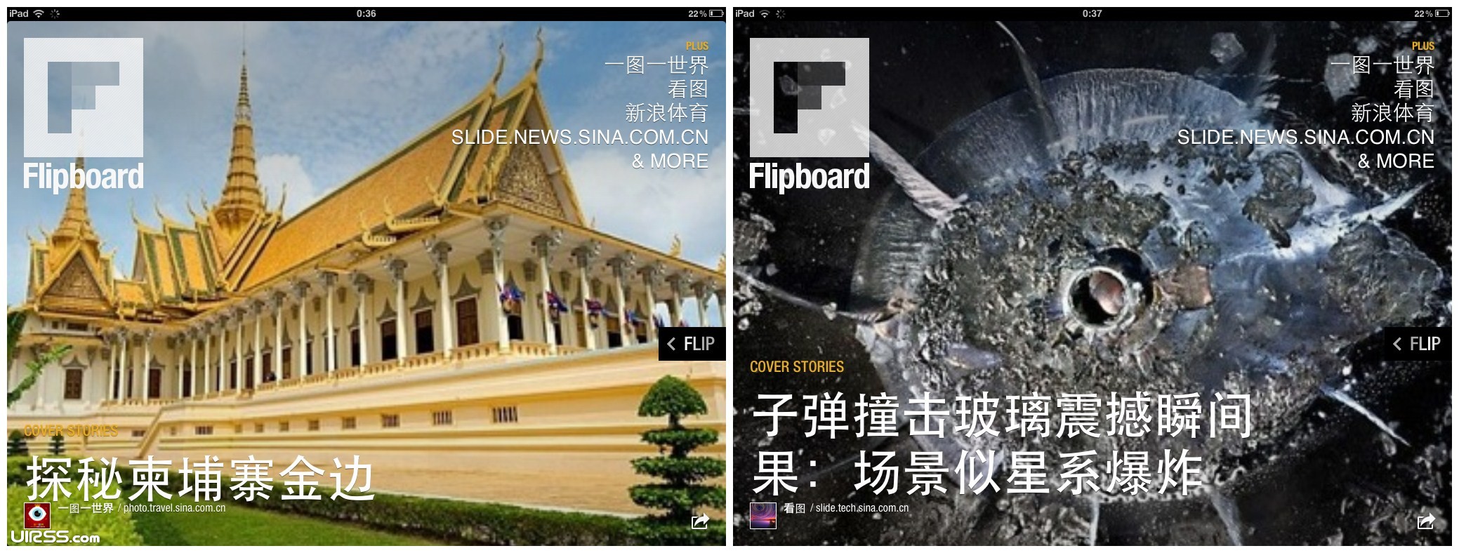如Flipboard打開(kāi)應(yīng)用時(shí),cover從舊版的固定圖片變?yōu)槟阌嗛唭?nèi)容的圖片,在第一時(shí)間建立起閱讀內(nèi)容和用戶(hù)的聯(lián)系,在等待過(guò)程的同時(shí)閱覽正在更新的信息。