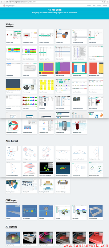 這樣綜合并可搜索的手冊入口居然還常被問及 HT 的 Demo 在哪里?只能怪這些年深入人心的用戶體驗理念,把人慣得包括很多程序員都如此之“懶”,當然也怪我們沒把用戶體驗的最后一公里做到位,于是最近 wangyinlong 同學人工例子抓圖,將數百個手冊例子進行了歸類整理,最終形成了方便大家直觀查找所有 HT 例子的頁面:http://www.hightopo.com/demos...