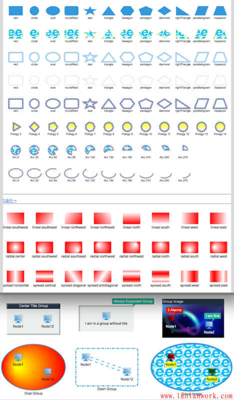 剛才的例子我們提到了一個 Group 類型,這個類型圖元節點在 GraphView 上顯示成了組合效果,可雙擊展開合并,可跟隨著孩子節點的位置大小變化和自適應變動,除了 Node、Edge、Group 外,HT 還提供了 Shape、Polyline、Grid、SubGraph 等多種圖元類型,這些圖元類型都具是有針對性的展示效果,以滿足各種行業的基本圖元需求:http://www.hightopo.com/guide...