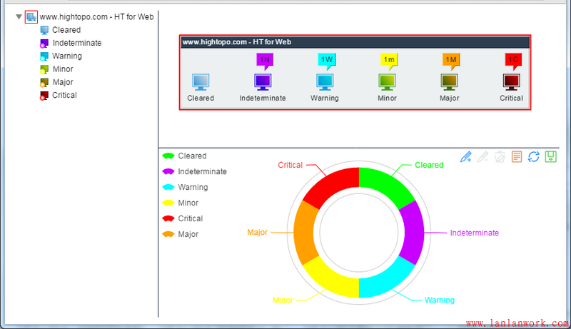 當然你也可以把 HT 與 百度 ECharts 進行整合,只要是 HTML 圖形組件就可以整合到 HT 的布局容器中,可參考《ECharts整合HT for Web的網絡拓撲圖應用》,此例子將 ECharts 整合 HT 拓撲圖做了告警統計的圖表呈現效果: