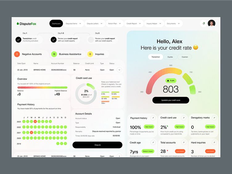 • 信息層級:以信用分 803 為核心視覺錨點,用弧形儀表盤直觀展示分數區間,同時拆解還款歷史、信用卡使用率等關鍵指標,讓用戶快速掌握信用狀態,契合北京蘭亭妙微 “專業數據輕量化呈現” 的設計理念。