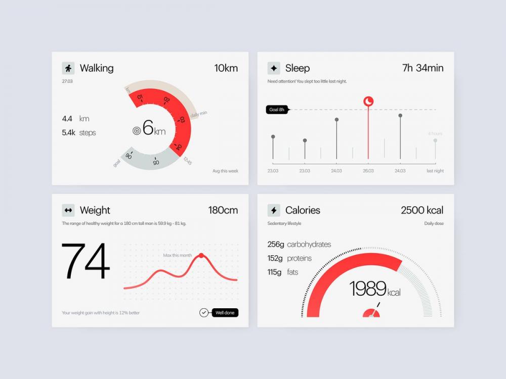 • 信息分層:核心數據(步數、體重)突出展示,輔助數據(熱量、睡眠)有序排布,避免信息過載。