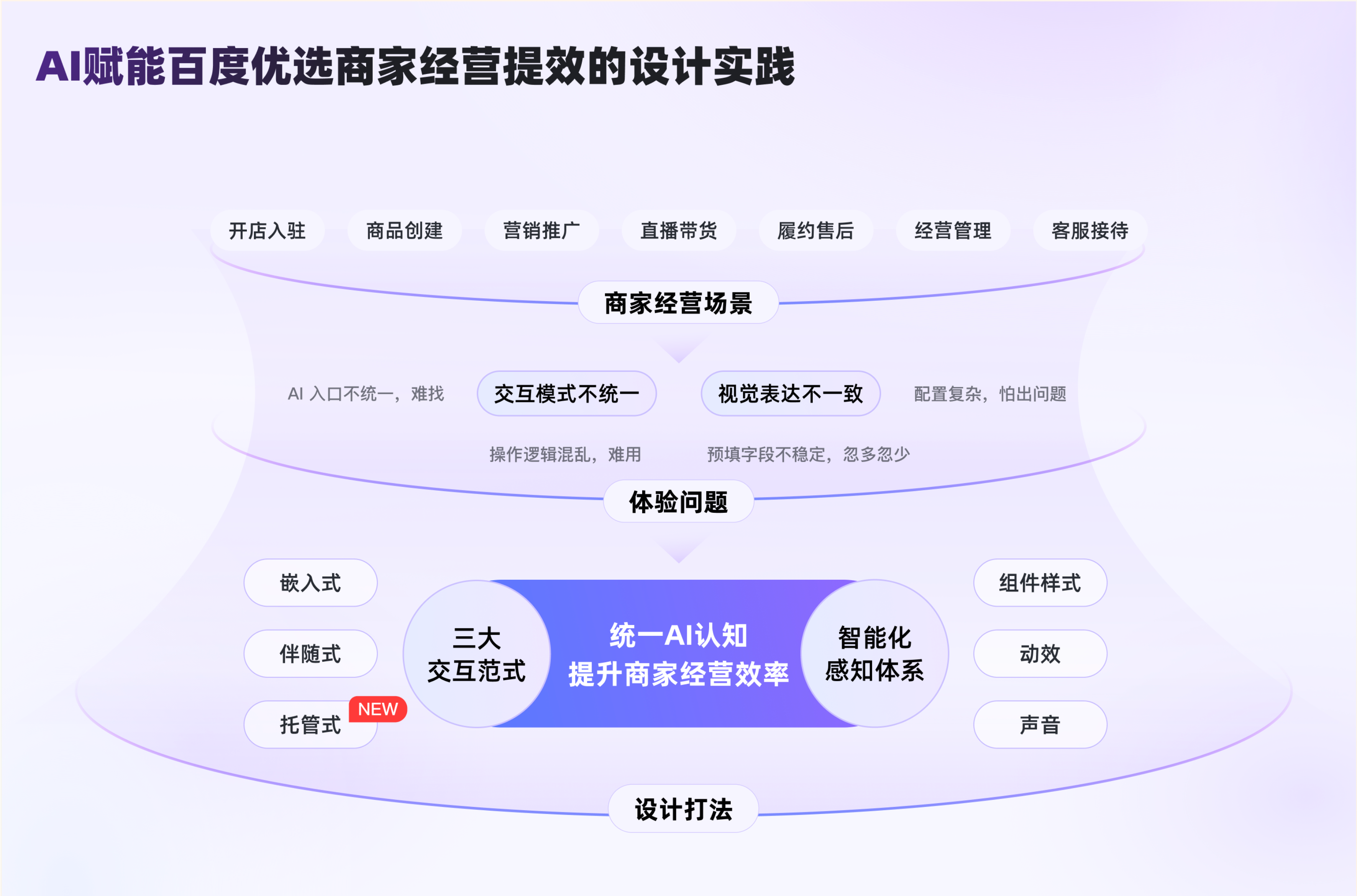 本次百度優選商家后臺 AI 體驗升級,始終以 **“以商家提效為中心”** 為設計核心,通過 “場景篩選適配 + 交互形態創新”,落地嵌入式、伴隨式、托管式三大交互范式,精準破解商品創建、多線程經營、客服接待等核心場景的使用痛點;同時構建 “視覺 + 多感” 的智能化感知體系,從根本上解決商家 “不會用、不敢信” 的體驗困境。