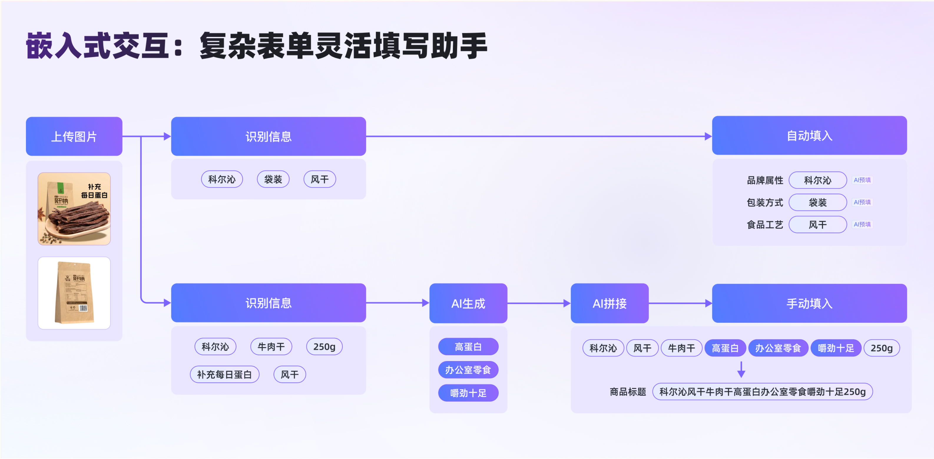 嵌入式交互的核心是讓 AI 生成結果緊鄰用戶操作場景,實現輕量便捷的交互體驗,核心適配復雜表單填寫類場景,以商品創建環節為典型代表 —— 該環節字段繁多、手動填寫耗時久,且易因填寫不規范被審核駁回,嚴重拉長發品周期。針對這一問題,我們根據字段特征與 AI 能力類型,設計了兩種差異化交互流程: