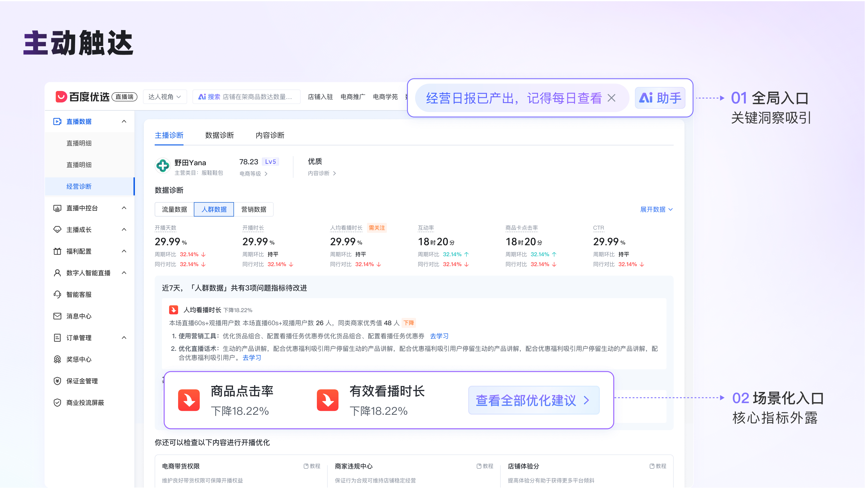 針對商家多線程經營時需頻繁跳轉各模塊、需自主發現經營問題的痛點,我們打造了深度融入經營動線的伴隨式交互方案,聚焦 **“主動觸達、連續洞察”** 兩大核心,讓 AI 助手跳出常規對話機器人的被動響應模式,轉變為結合工作流前后場景、提供落地行動指引的經營輔助工具。