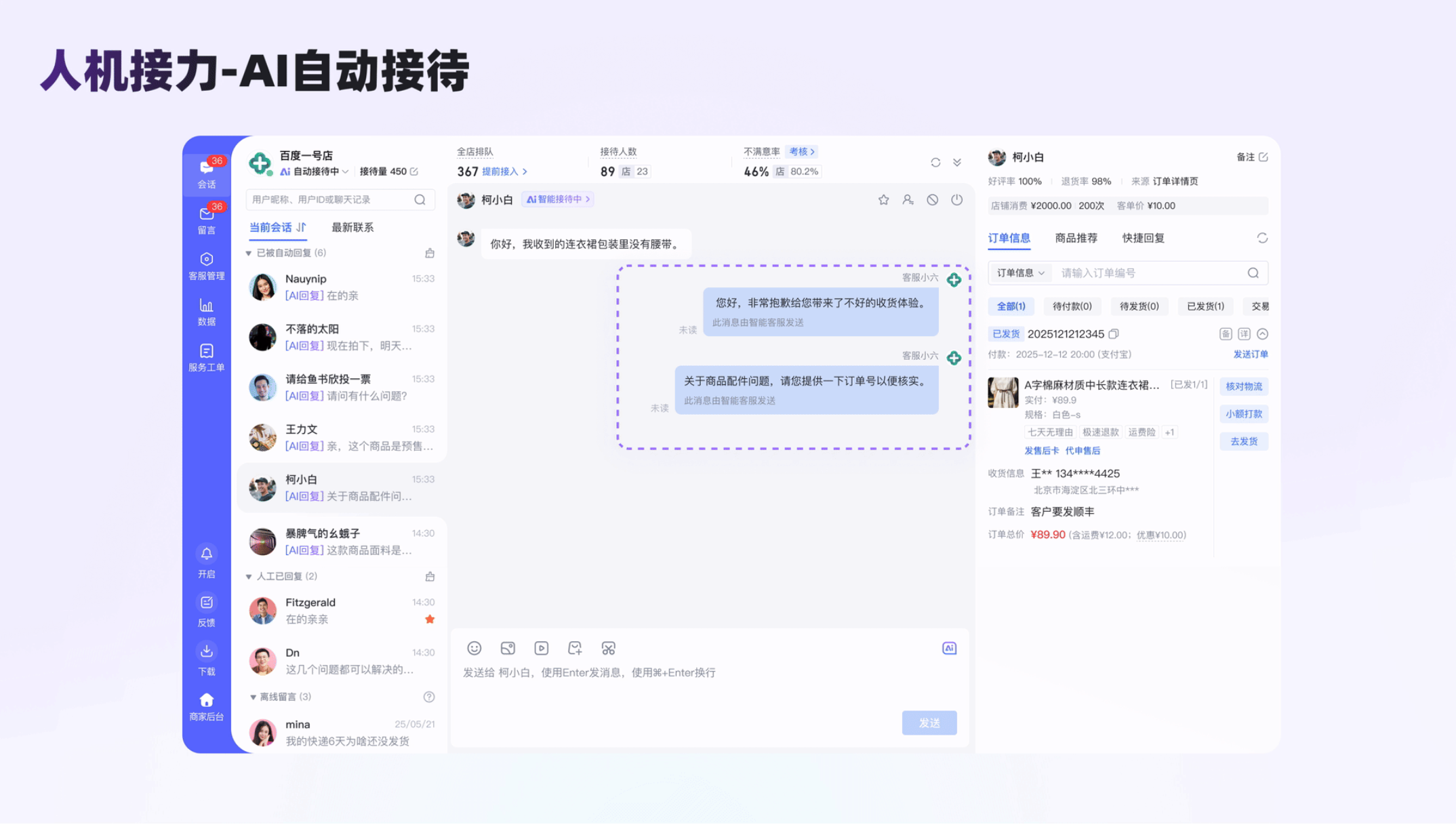 2. 明確狀態標識,實現流暢人機接力:為保障人機協同的順暢性,界面中對接待狀態進行全方位清晰標識:全局接待狀態置頂實時更新、會話列表按狀態動態分組、單人接待狀態(接待中 / 暫停接待)強化并自動同步。當 AI 無法解答復雜訴求、用戶負面情緒等問題時,會話將自動流轉至 “待人工回復” 分組,通過動態高亮 + 聲音預警提醒人工快速接管;人工回復后,AI 將自動暫停并更新接待狀態,同時生成會話摘要,幫助工作人員快速了解溝通前因后果,將決策焦點從 “梳理問題” 轉向 “解決問題”。此外,客服可主動設置 “恢復托管”,AI 也會在識別新會話時自動恢復接待,形成閉環的人機協同機制。image.png