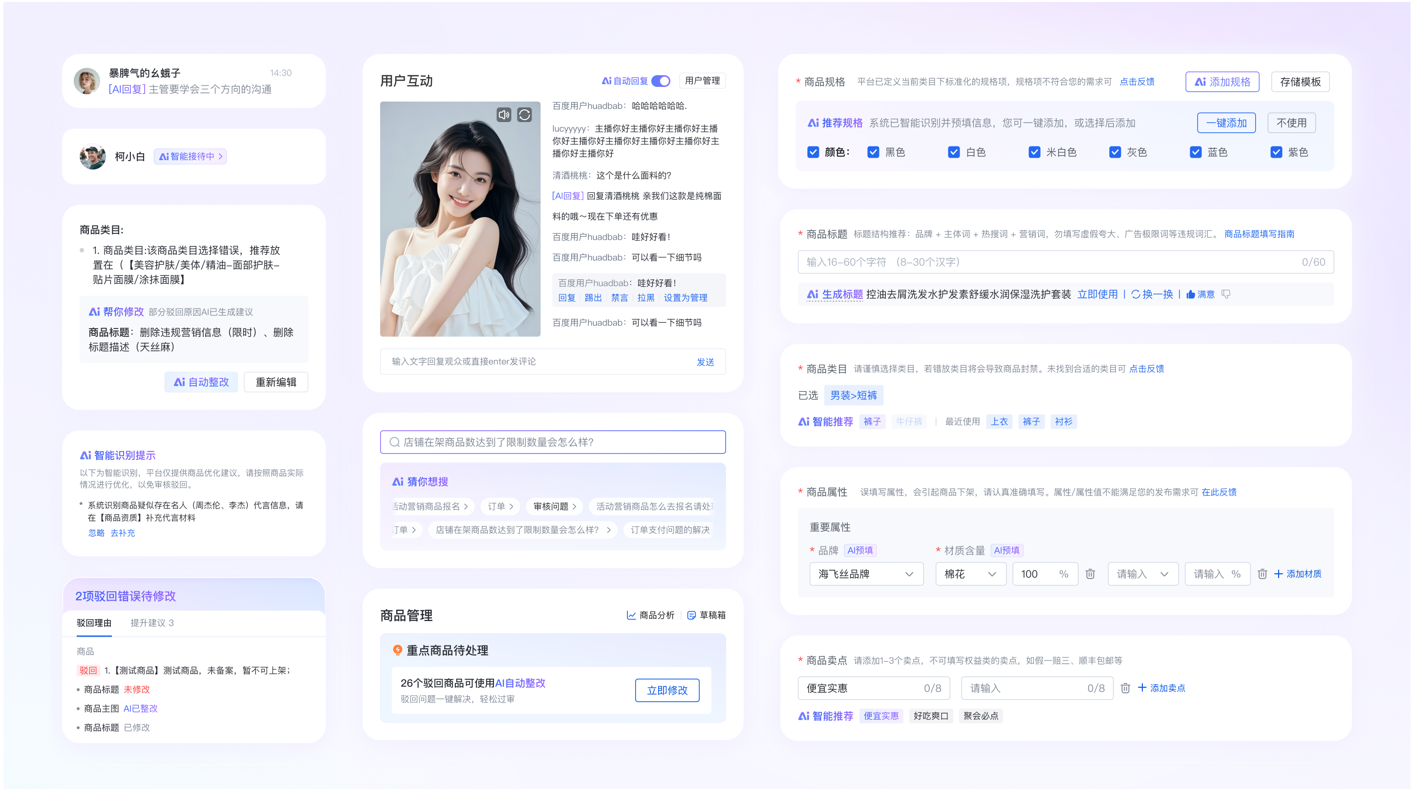 為此,我們以 **“統一 AI 認知,提升商家經營效率”為核心目標,啟動 AI 功能體驗升級工作。團隊立足行業主流的嵌入式、對話式、伴隨式三大 AI 交互形態,結合 B 端商家后臺的操作習慣展開審慎選型與創新設計:舍棄更適用于自然語言指令推進生產、以沉浸問答為主的對話式交互;同時針對客服、直播互動等需規模化、自動化運行的場景,創新提出“托管式”** 交互范式,適配低人工介入的服務需求。并同步搭建統一的 AI 視覺語言體系,最終打造出一套商家可統一理解、輕松調用、深度信任的智能體驗解決方案,全方位助力商家降本提效。