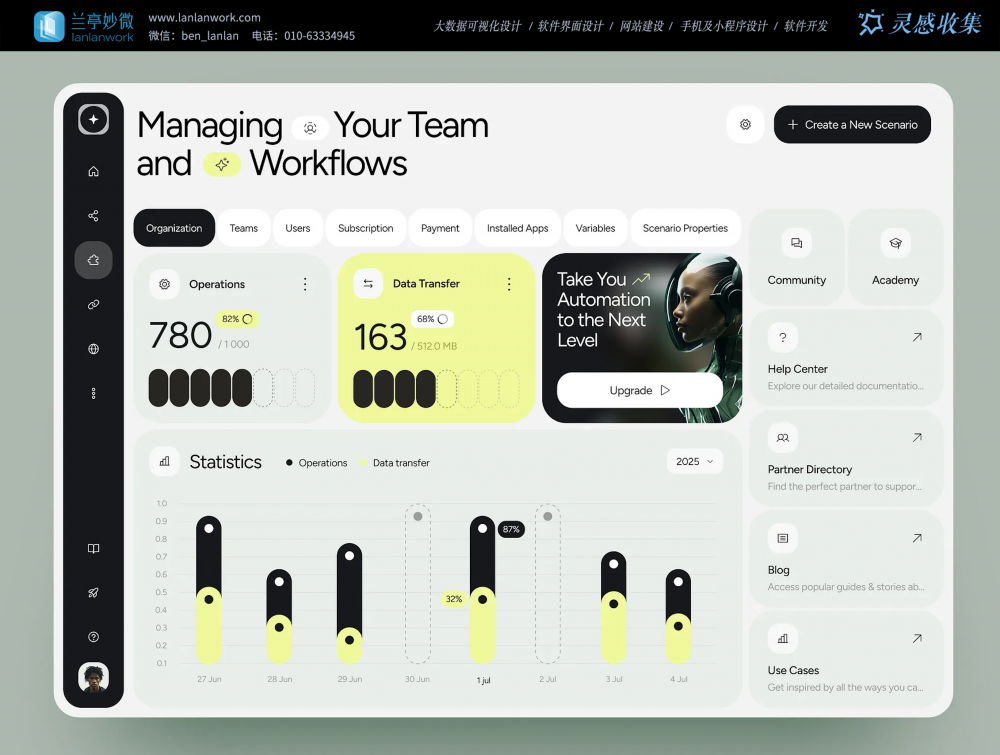 • 功能布局:頂部標簽區分組織、團隊、訂閱等模塊,核心區展示運營數據卡片與統計圖表,右側整合輔助功能入口;