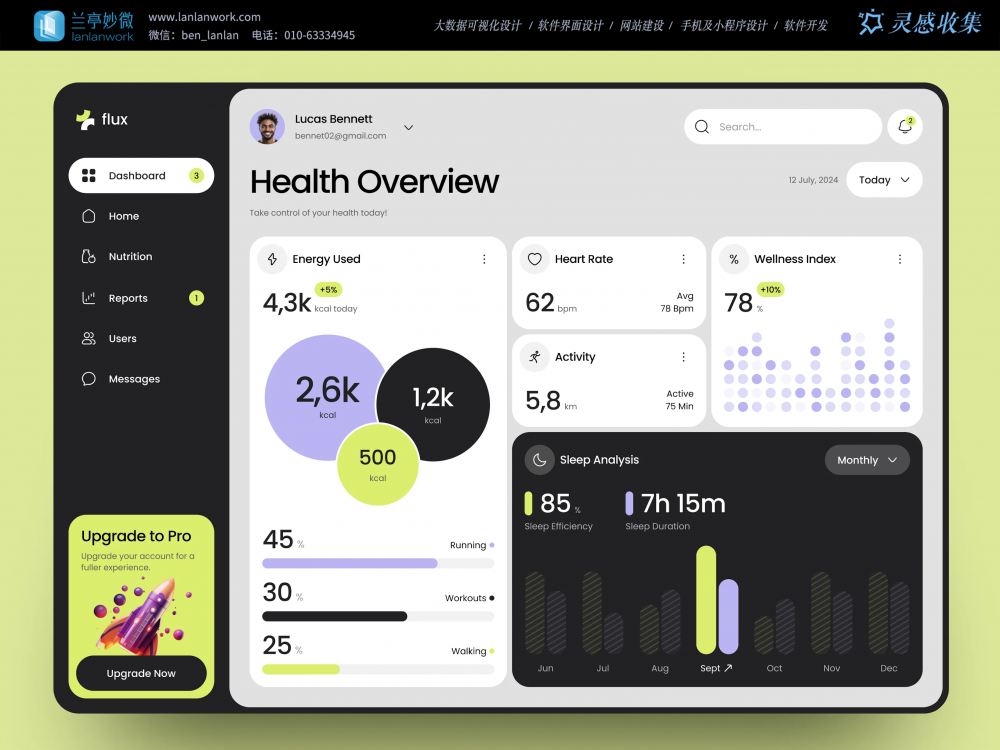 • 視覺風格:淡綠為主色調,搭配淺灰底色,傳遞健康自然的氛圍,數據以環形圖、進度條等輕量化形式呈現,避免復雜設計;