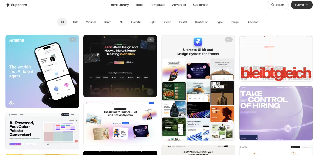 [Supahero](http://supahero.io) 專注于網站最重要的部分之一——英雄區(Hero Section)設計。這個區域通常是訪問者首先看到的部分,對于吸引用戶注意力至關重要。