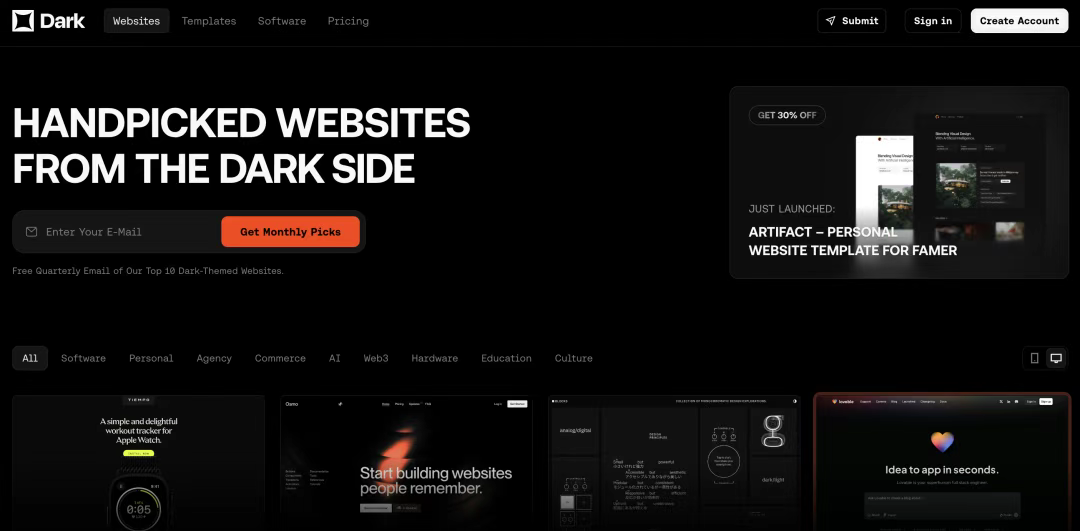 [Dark Design](http://dark.design) 專注于收集優秀的暗色模式網站設計。隨著暗色模式在各種平臺上的普及,這個資源變得越來越有價值。